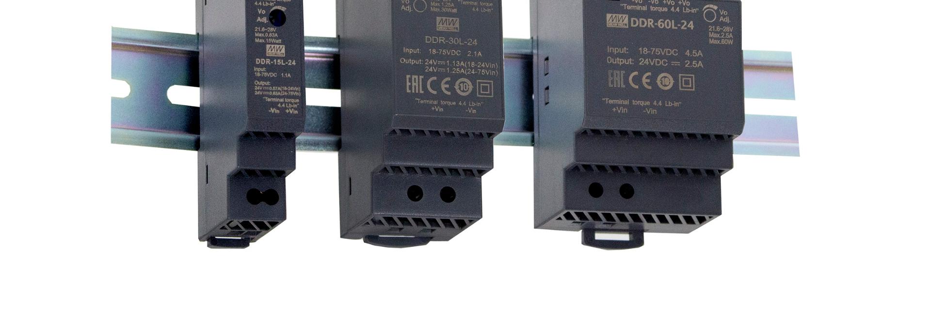 DDR-15, DDR-30 og DDR-60 til DIN Skinne montage. MEAN WELLs brede produkt program af DC/DC konverterer har allerede serier med åbne, indkapslede, overflade monterede og lukkede typer